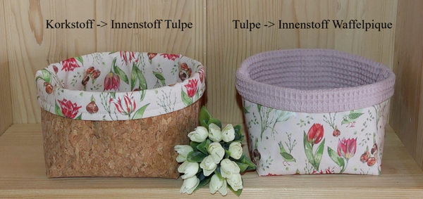 Die Utensilos sind aus Korkstoff bzw. Baumwolle gefertigt und der Innenstoff ist aus 100 % Baumwolle, verstärkt mit Bügelvlies aus 100 % Polyester.