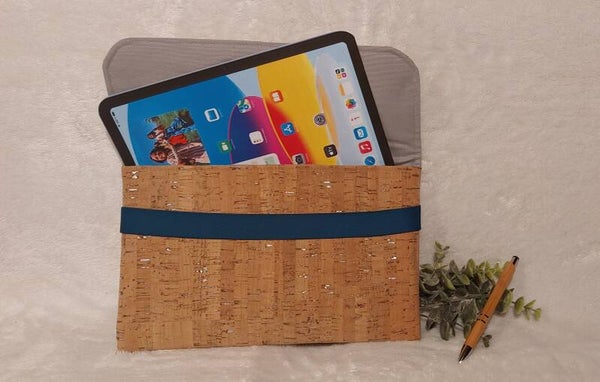 Maße ca. 18 x 25 cm, max. 11 Zoll - Tablet-Hülle aus Korkstoff mit Goldglitzer und Innenfutter grau