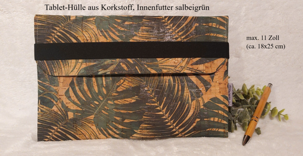 Maße ca. 18 x 25 cm, max. 11 Zoll - Tablet-Hülle aus Korkstoff mit Blätter und Innenfutter salbeigrün